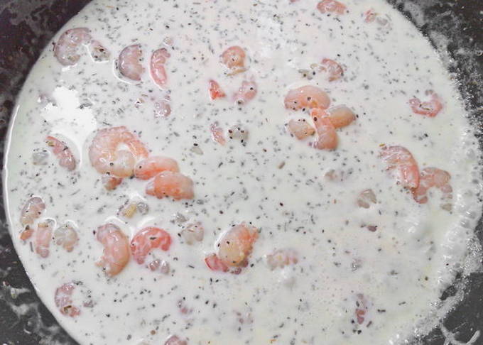 - Voeg de room en het vocht waarin de pasta gekookt is toe aan de pan. Breng alles aan de kook, af en toe roeren. Doe de garnalen en spaghetti bij de saus, roer om en laat nog 2 minuten afgedekt op middelhoog vuur staan.