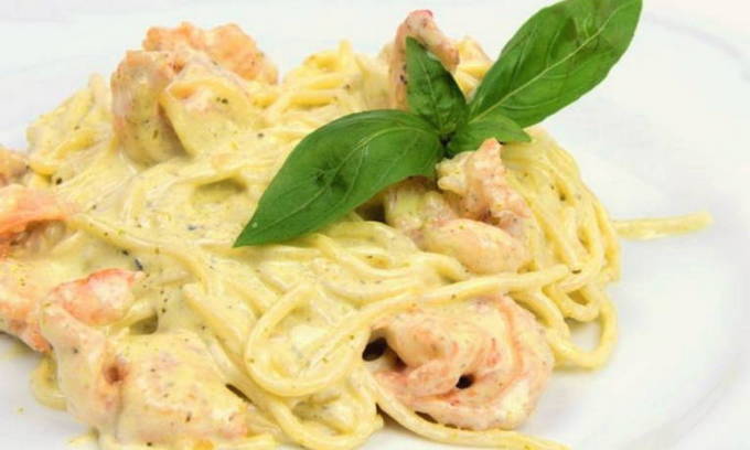 Garnalen en inktvis hebben een zeer delicate zoetige smaak, die goed wordt aangevuld door room met knoflook. Pasta met dergelijke zeevruchten blijkt verfijnd en zacht te zijn. Als je verse kruiden toevoegt, is de lunch puur mediterraan.