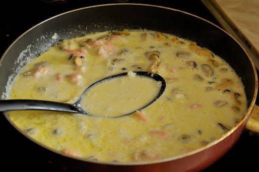 - Giet room over de zeevruchten, breng op smaak, voeg kruiden toe en laat 5-7 minuten op middelhoog vuur sudderen.