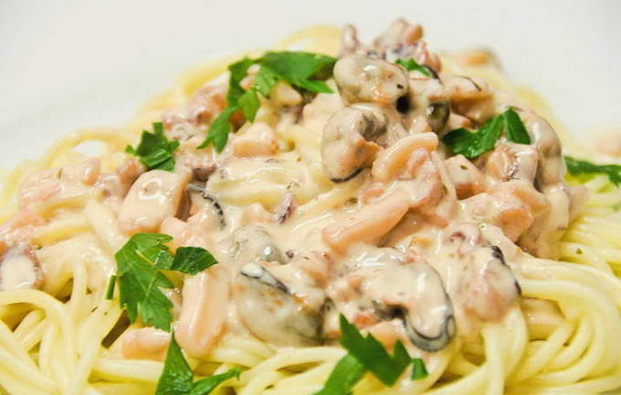 Garnalen en mosselen vullen pastagerechten goed aan, en de romige saus maakt ze nog lekkerder. Dit gerecht is niet lang bereid en is vrij eenvoudig, dus een kok met enige ervaring kan het betalen.