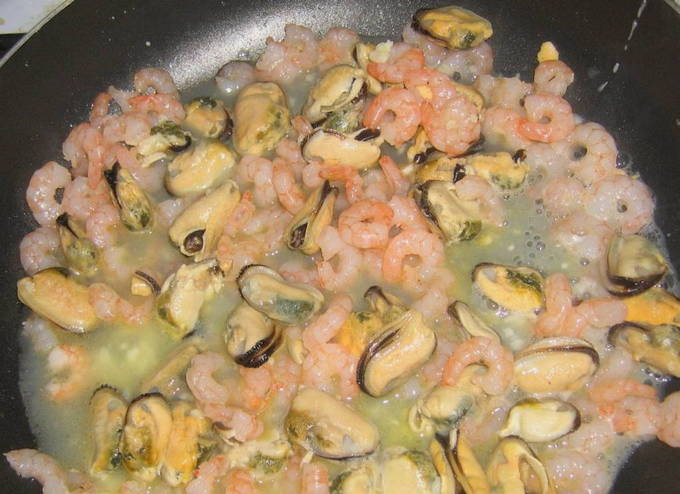 - In voorverwarmde olie in een frituurpan de garnalen 2 minuten bakken, daarna de mosselen op dezelfde plaats zetten en nog 1 minuut bakken. Doe de zeevruchten in een andere kom.