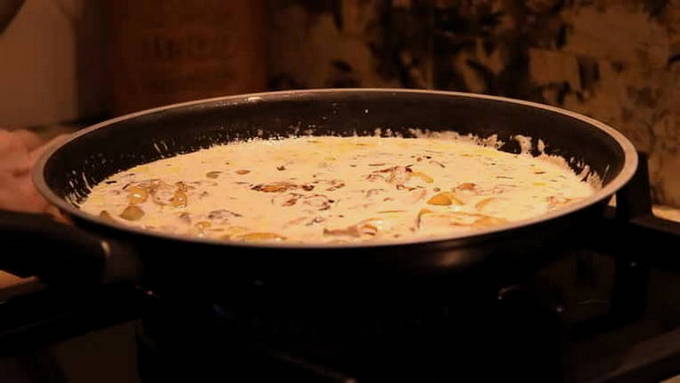Zeevruchten en champignons zijn een goede combinatie voor fijnproevers. Champignons geven de pasta een geweldig aroma en vullen de zeevruchtensmaak van garnalen, mosselen en inktvis aan. Bij het maken van een romige saus is het belangrijk om de room niet te laten koken, anders gaat het stratificeren en krijgt de saus niet de gewenste consistentie.