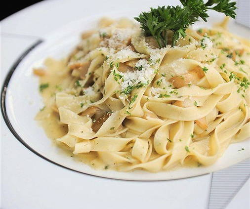 - Tagliatelle nestelt in een romige saus met zeevruchten en champignons