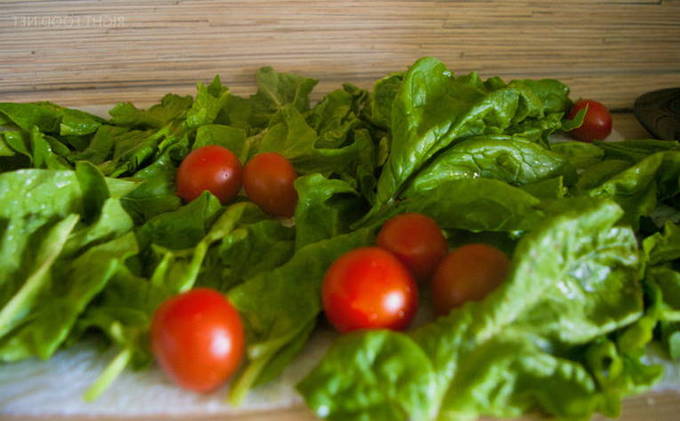 - Verhit de olie in een koekenpan en bak hierin de cherrytomaatjes 2 minuten op laag vuur, voeg dan de spinazieblaadjes toe en bak nog een minuut.