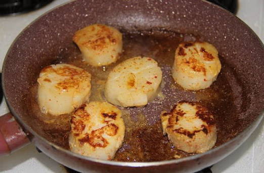 - Droog de sint-jakobsschelpen af met keukenpapier en bak ze in een andere pan met olie gedurende 1,5 minuut aan elke kant. Er moet een rossige korst bovenop verschijnen en van binnen zullen ze zacht en zacht zijn.