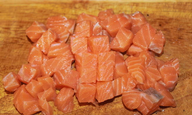 - Snijd de vis in kleine plakjes of blokjes, bak ze in een diepe koekenpan met een beetje olie en geperste knoflook.