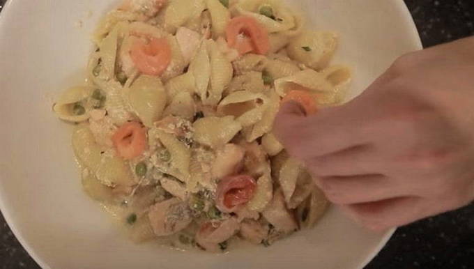 - Voeg de vloeistof die overblijft na het koken van pasta en room toe aan vis en zeevruchten. Breng op smaak met de juiste hoeveelheid kruidenmengsel, zout. De smaken van zeevruchten en vis worden goed benadrukt door versgemalen zwarte peper, die in dit stadium kan worden toegevoegd. Kook een paar minuten op middelhoog vuur, af en toe roeren.
