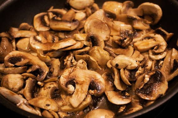 - Snijd de champignons in plakjes, snipper de ui. Bak de uien en champignons goudbruin, dit duurt een paar minuten. Leg ze in een ander gerecht.