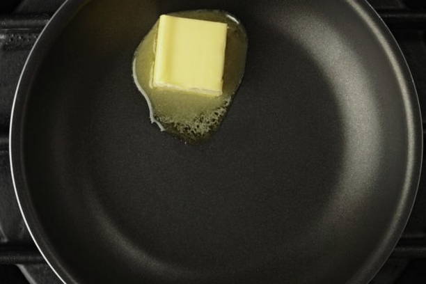 - Los de boter op in een koekenpan en fruit hierin de geperste knoflook 2-3 minuten, haal het dan uit de pan als het zijn aroma aan de boter geeft.