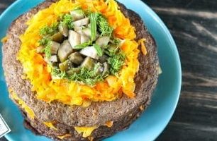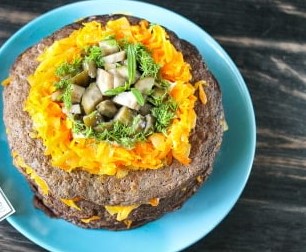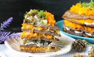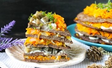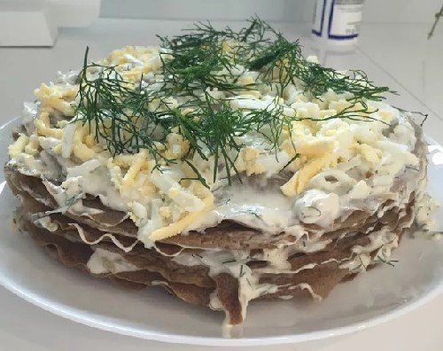 - Leg de pannenkoek op een bord en vet deze in met een mengsel van mayonaise en groenten. Daarna verspreiden we de volgende pannenkoek en bedekken deze opnieuw met de vulling. Op deze manier herhalen we alle lagen. Garneer de laatste laag met geraspte gesmolten kaas en fijngehakte kruiden.