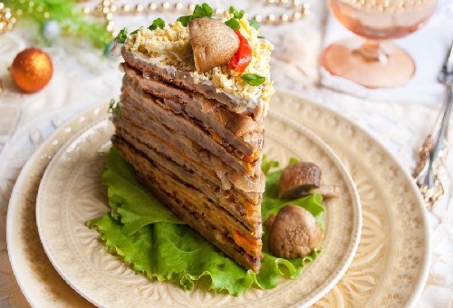 - Leg een pannenkoek op een bord en bestrijk deze met mayonaisemassa en leg het paddenstoelenmengsel erop. We bekleden ook de volgende pannenkoek met paddenstoelenvulling en mayonaise. En besmeer de derde met kaas en vet in met mayonaisemengsel. Zo smeren we 2 t/m 1 alle lagen.