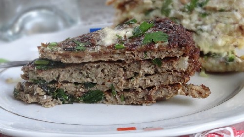 - Dan maken we een laagcake. Leg een pannenkoek op een bord en vet deze in met plantaardige frituur met zure room. Bestrooi met kruiden en dek af met de volgende pannenkoek. We smeren het ook in en besprenkelen met kruiden. Dit doen we bij alle pannenkoeken.
