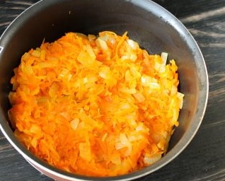 Schil de uien en wortelen. Rasp de wortelen met een grove rasp en snijd de uien in kleine stukjes. Meng ze samen en bak ze in plantaardige olie, zodat de massa zacht wordt - ongeveer 7-10 minuten.