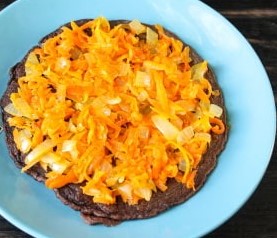 Leg een pannenkoek op een vlakke plaat en daarop - een deel van het frituren van groenten.