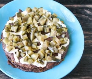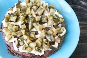 Bedek het met een andere leverpannenkoek. Besmeer het met mayonaise. Snijd vervolgens de ingelegde komkommers in kleine blokjes en leg deze op de mayonaise.