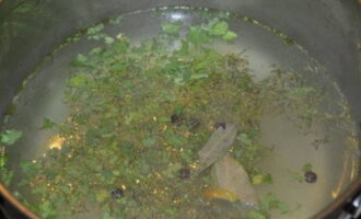 Giet water in een aparte pan en breng het aan de kook, voeg dan peper, zout, laurier en kruiden toe en kook alles 5 minuten.