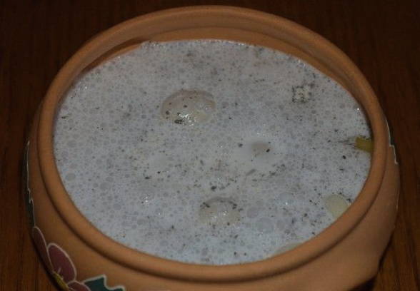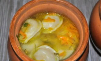 - Giet de bouillon die overblijft na het koken van de dumplings in de potten.