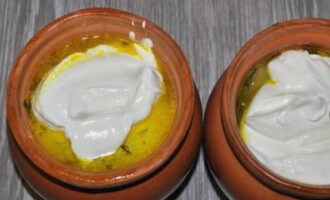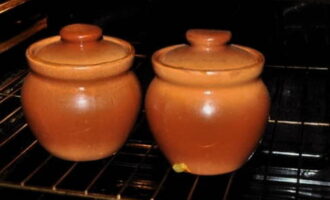 - Bedek de pot met een deksel en stuur deze een half uur naar de voorverwarmde oven.