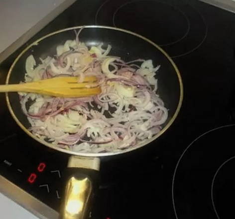 - Verhit de olie in een koekenpan en fruit hierin de ui tot hij zacht is.