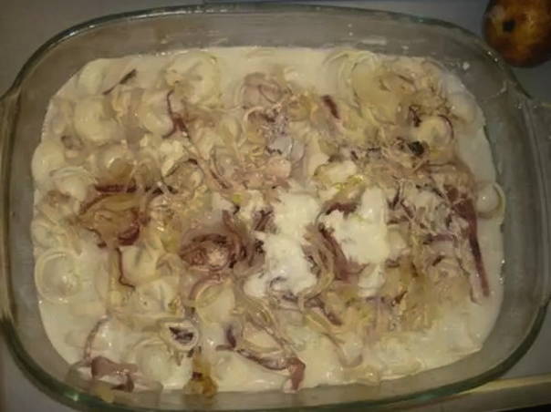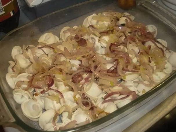 - Vet de ovenschaal in met boter en leg de dumplings op de bodem, bedek ze met uien erop.