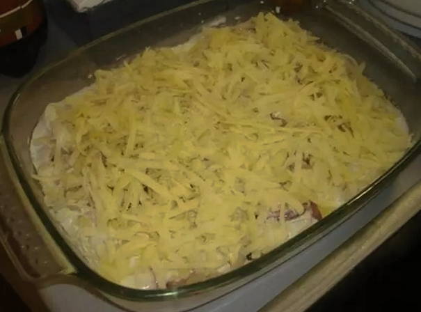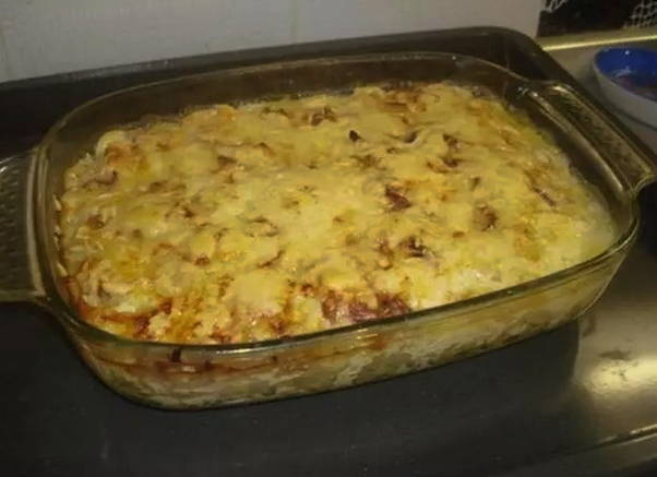 - We sturen het formulier 15 minuten naar de oven op 180 graden. Verwijder enkele minuten voor het einde de folie om een kaaskorst te vormen.Eet smakelijk!