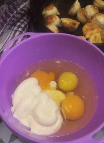 - Leg de dumplings in een ovenschaal en schenk het ei-mayonaise mengsel erbij.