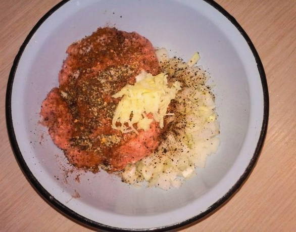 - Voeg kruiden en gehakte knoflook toe aan het gehakt en meng goed.