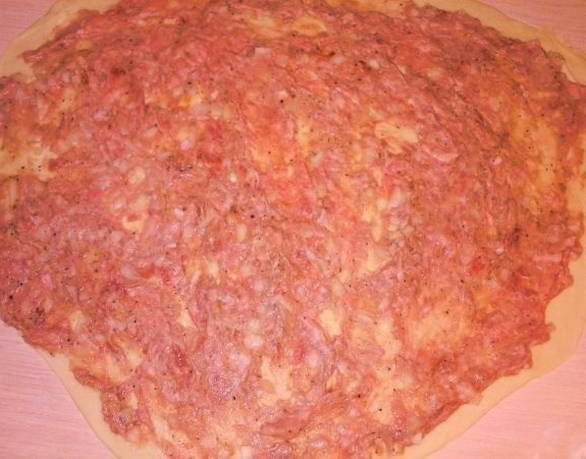 - Rol het deeg uit en verdeel het gehakt er gelijkmatig over.