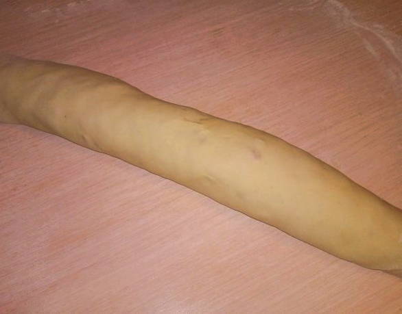 - Rol het deeg uit tot een rol en snijd deze in stukken van ongeveer 2 centimeter breed.