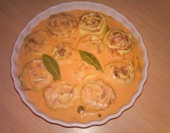 - Vul de dumplings met de resulterende saus, voeg het laurierblad toe.