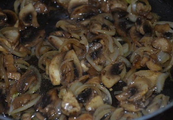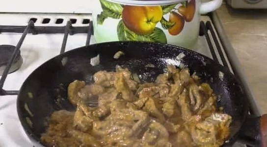 - Fruit de ui en knoflook in hete plantaardige olie tot ze zacht zijn, voeg dan de lever toe aan de pan en roer. Dek af met een deksel en laat ongeveer 3 minuten sudderen.