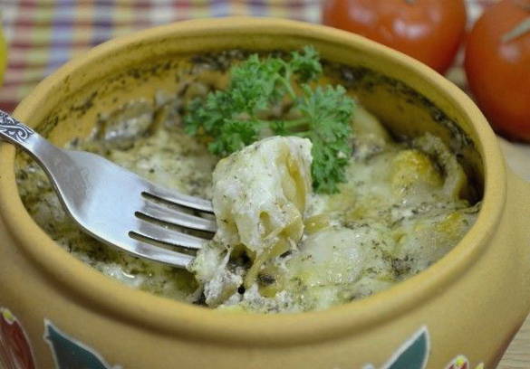 In de oven gebakken dumplings smaken veel interessanter dan alleen gekookte. En als je ze in een pot bakt met de toevoeging van champignons en kaas, krijg je een gerecht dat zelfs een feestelijk feest waardig is.