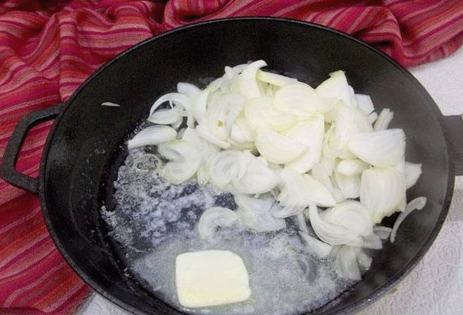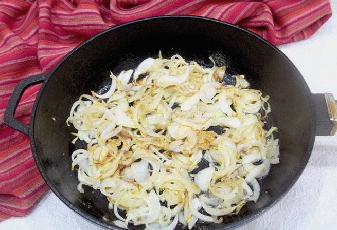 - Pel de ui, spoel af en snijd in halve ringen. We verspreiden het in boter, eerder gesmolten in een pan.