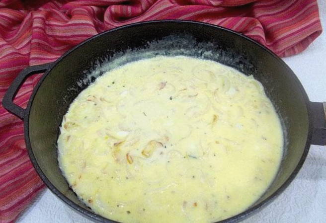 - Giet de room in de pan en voeg het ei toe, daarna peper en zout naar smaak.