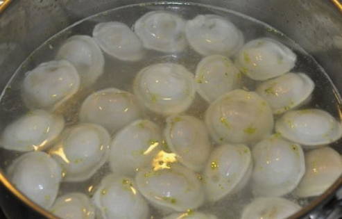 - Wanneer het water in de pan kookt, zout het en giet de dumplings erin, kook ze tot ze half gaar zijn.