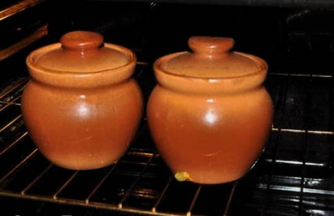 - Bedek de pot met een deksel en stuur deze een half uur naar de voorverwarmde oven.