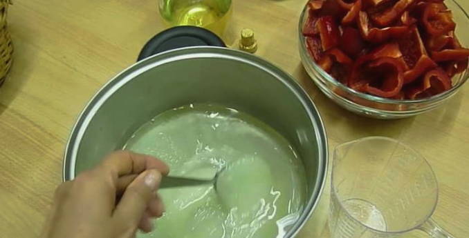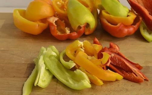 - Verwijder de steel, het zaadgedeelte van de paprika en spoel hem af onder stromend water. Snijd in kleine plakjes en stuur naar een pan met marinade.