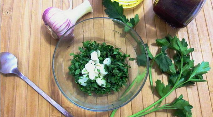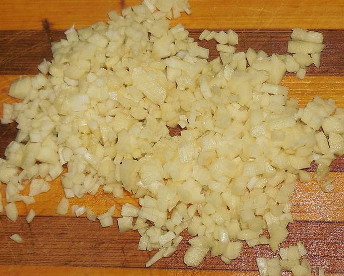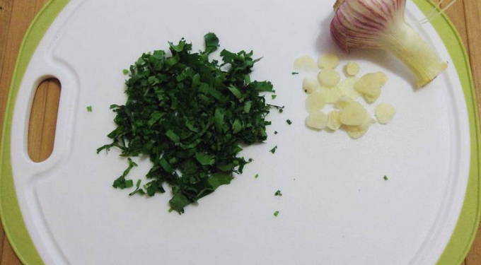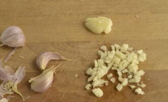 - We demonteren anderhalve bol knoflook in teentjes, schillen en hakken zo fijn mogelijk (het wordt niet aanbevolen om een pers te gebruiken, omdat het de stukjes zijn die nodig zijn).