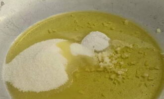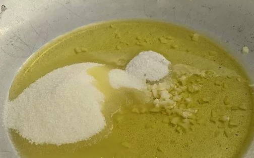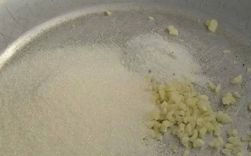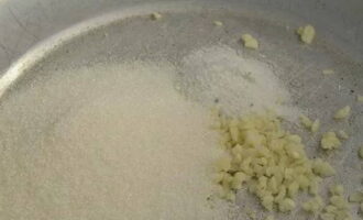 Laten we voor de marinade zorgen. Combineer gehakte knoflook, zout en kristalsuiker in een pan.