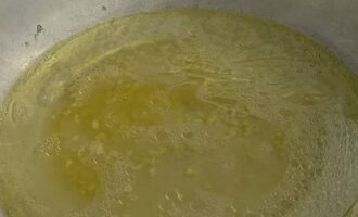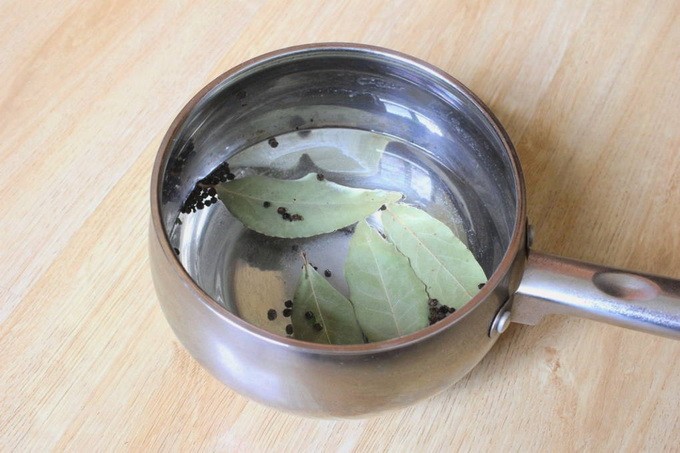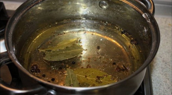 - Breng in een pan het water aan de kook en voeg zout, suiker, laurierblaadjes, peperkorrels en 250 milliliter plantaardige olie toe.