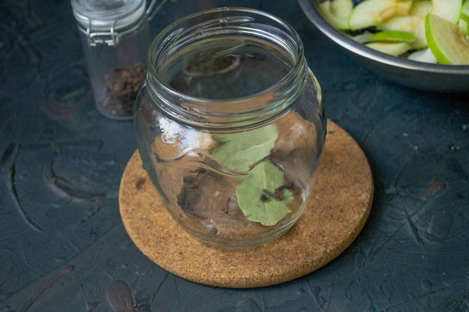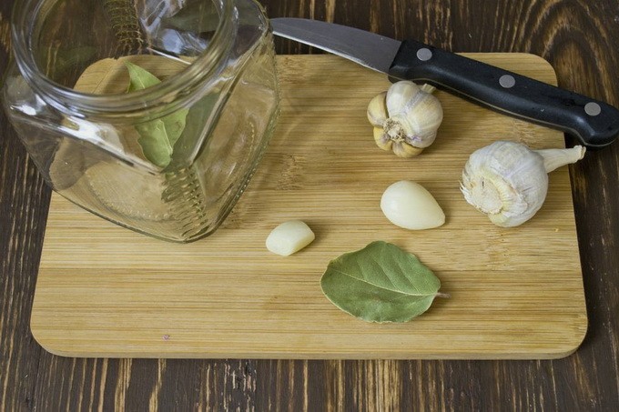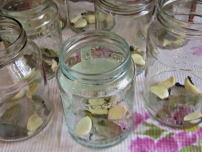 - We steriliseren de potten, drogen ze en leggen op de bodem van elk een paar teentjes knoflook, 3 erwten piment en hete peper, een paar laurierblaadjes en 2-3 knoppen van geurige kruidnagel.