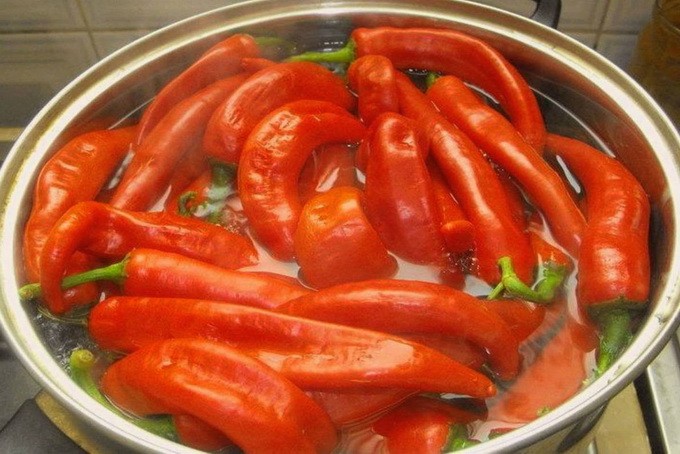 - Doe de peper voorzichtig in de potten en vul deze met hete pekel - sluit met schroefdoppen of rol op.