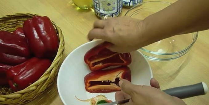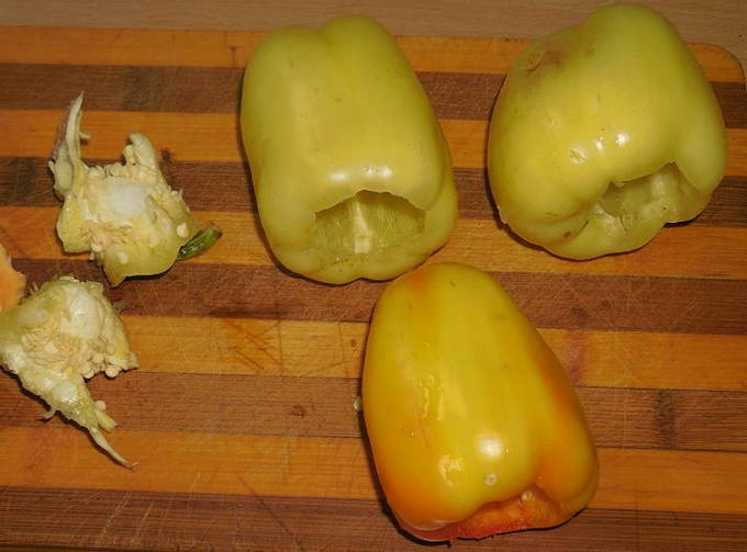 - Om deze snack te bereiden, kun je het beste een grote paprika gebruiken zonder zichtbare gebreken. Spoel elke vrucht grondig met water en snijd voorzichtig de steel en zaaddoos eruit.