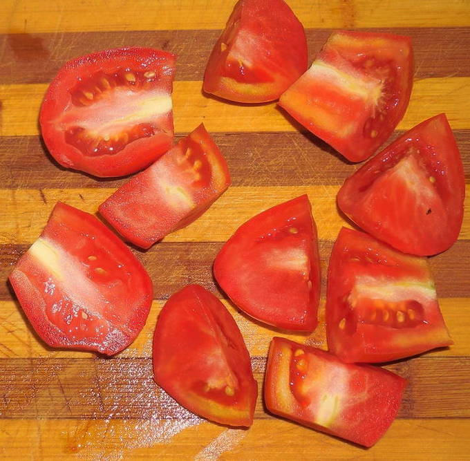 - Terwijl de peper afkoelt, snijd je de tomaten (het is het beste om de "room" variant te nemen) in 4 delen.