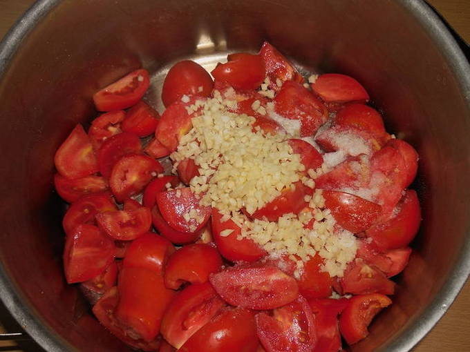 - Combineer de knoflook, tomaten en zout in een diepe kom - goed mengen en de geurige vulling is klaar.