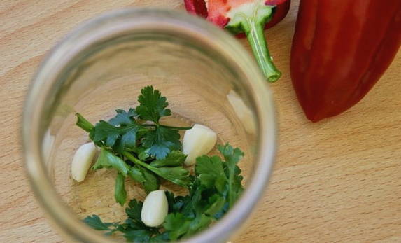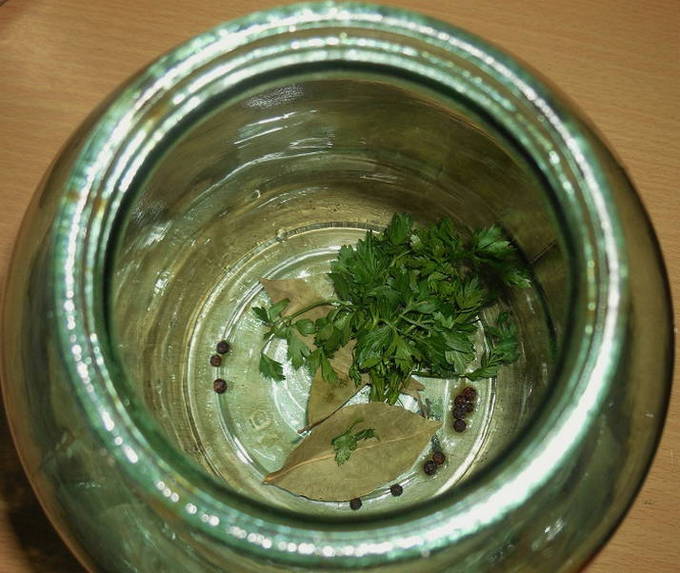- Doe kruiden op de bodem van schone en droge potten: 3 laurierblaadjes, 10 peperkorrels en een paar takjes peterselie.
