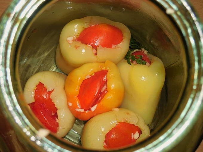 - Vul vervolgens de geblancheerde paprika's met tomaten en knoflook en zet ze in een pot strak tegen elkaar aan.