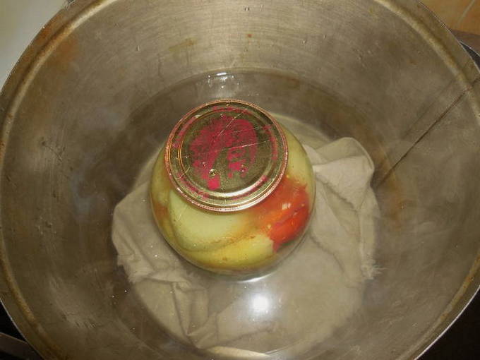 - Leg voor sterilisatie een doek op de bodem van een grote pan, giet water en zet een pot. We koken en "koken" ongeveer een half uur.