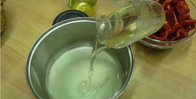 - Laten we voor de marinade zorgen. Giet water in een pan en voeg zout, kristalsuiker en boter toe - breng aan de kook en doe dan laurier en peperkorrels. Zodra de vloeistof begint te borrelen, giet je er 200 milliliter azijn in.
