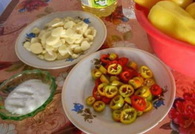 - Laten we beginnen met de bereiding van producten: we spoelen twee soorten paprika's grondig onder stromend water en drogen ze. We reinigen de peul van een pittige groente van zaden en snijden in ringen en snijden een paar teentjes knoflook in dunne borden.